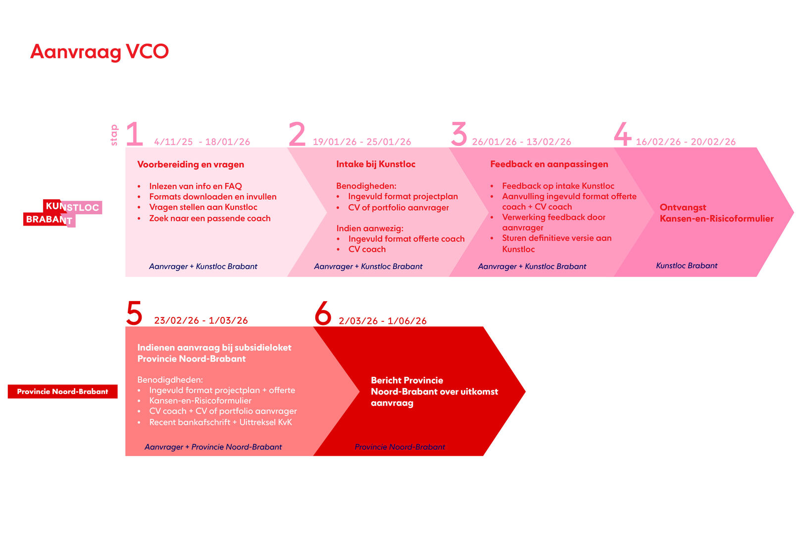 Wil je een aanvraag Versterken Cultureel Ondernemerschap (VCO) indienen bij de provincie in 2026? Dan kun je nu al eerste stappen zetten en daarbij feedback krijgen van Kunstloc. Voordat je je aanvraag bij de Provincie Noord-Brabant indient doe je een intake bij Kunstloc Brabant om een Kansen-en-risicoformulier te ontvangen. Hieronder vind je de stappen die je doorloopt om je aanvraag te doen.